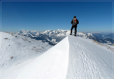 Normann und ich starten vom Parkplatz "Mauerreith" in Annaberg zu unserer Schneeschuhtour am Fuße der Bischofsmütze. Nach einer ersten Rast bei der Mahdalmhütte steigen von der Alm direkt zum Losegg-Kamm auf. Nach der Überschreitung des flachen Gipfelkammes und kurzem Abstieg geht es weiter mit dem stellenweise recht steilen Anstieg zum Kamplbrunn. Am Gipfel herrliche Ausblicke in die Schladminger Tauern, zum Hochkönig, Tennengebirge, und dank großartiger Fernsicht auch zu den höchsten Gipfeln der Hohen Tauern. Trotz starken Windes halten wir uns ca. 1 Stunde am Gipfel auf. Für den Abstieg wählen wir den Weg über die Loseggalm. Leider mußten wir bereits beim Abstieg erfahren, dass ein Schifahrer im Gipfelbereich tödlich verunglückt ist. Die Berge sind sehr schön, aber es lauern auch viele Gefahren. Daran wurden wir heute wieder einmal schmerzlich erinnert.![]() |